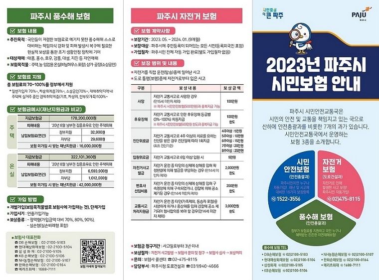 [제주교통복지신문 김강석 기자] 파주시는 시민안전교통국 산하 소관부서에서 관리하는 시민보험(▲시민안전보험 ▲풍수해보험 ▲자전거보험)의 내용을 하나의 홍보물에 담아 파주시 전 부서 및 읍면동에 1만 2천 부를 배부했다.