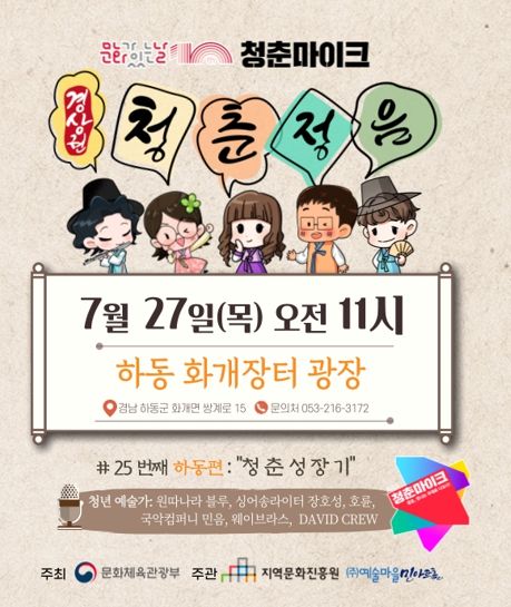 [제주교통복지신문 김강석 기자] 하동군은 본격적인 여름 휴가철을 맞아 오는 27일 오전 11시 화개장터 문화多방에서 문화가 있는 날 ‘청춘마이크’ 경상권 공연을 연다고 24일 밝혔다.