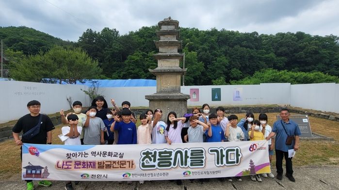 천안시 서북구 성거읍에 위치한 ‘천흥사지’지역을 탐방하고 성거읍 마을과 연계해 직접 사적지에 대한 설명을 듣는 프로그램은 기본적인 역사교육을 시작으로 △천흥사지 5층석탑 관람 △천흥사지 당간지주 관람 △역사기행기록 등을 진행한다.