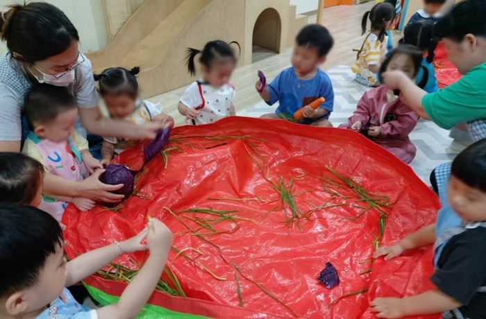 이날 서천센터는 자체 제작한 그림책 ‘채소가 좋아!’를 구연하고, 채소 알려주기(부추, 당근, 적양배추)와 밀가루 활용 오감 체험 놀이 등 ‘삼색 채소 수제비 반죽 만들기’ 활동을 진행했다.