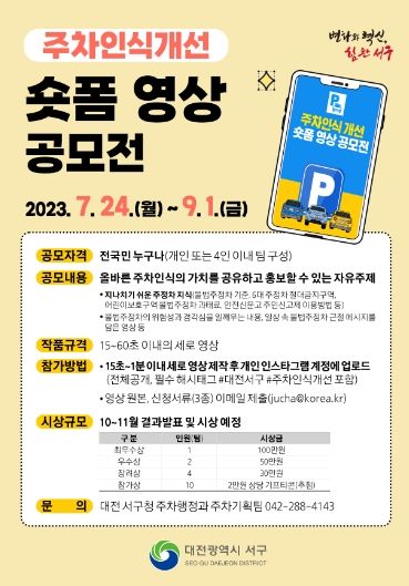 [제주교통복지신문 김강석 기자] 대전 서구는 24일부터 9월 1일까지 주차인식 개선 숏폼영상 공모전 출품작을 접수한다고 밝혔다.