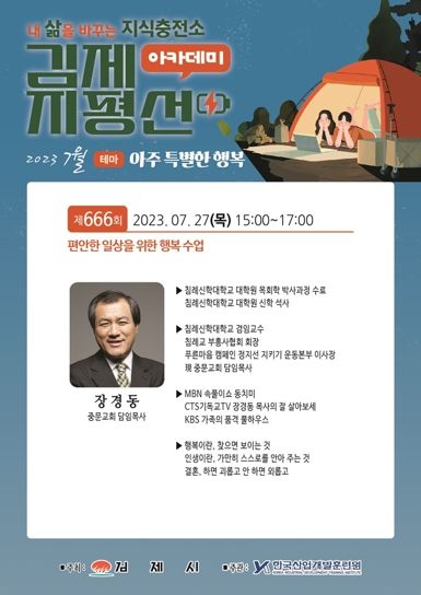[제주교통복지신문 김강석 기자] 김제시는 7월 27일 제666회 지평선아카데미에 장경동 중문교회 담임목사를 초청하여 “편안한 일상을 위한 행복수업”이라는 주제로 강연을 진행한다.