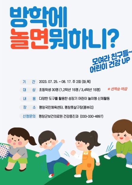[제주교통복지신문 김강석 기자] 평창군보건의료원은 여름방학을 이용하여, 성장기 어린이를 대상으로 운동습관 형성 및 비만예방을 위한 놀이형 신체활동 프로그램을 운영한다고 밝혔다.