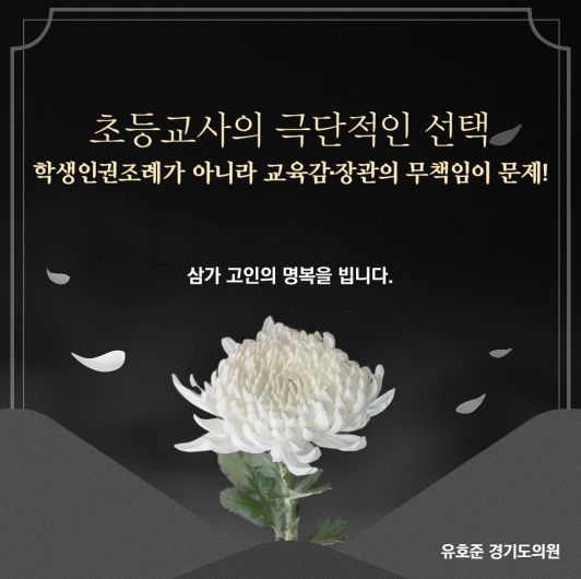 [제주교통복지신문 김강석 기자] 임태희 교육감이 서울 지역 초등교사의 극단적인 선택 등 연이은 교권침해 사안에 대한 후속 조치로 ‘학생인권조례’를 ‘학생권리·책임조례’로 개정하겠다는 입장을 밝힌 것에 대해 경기도의회 유호준 의원(더민주, 남양주6)이 교육감의 책임은 외면하고 학생인권에게 책임을 떠넘기는 나쁜 정치라며 반대에 나섰다.