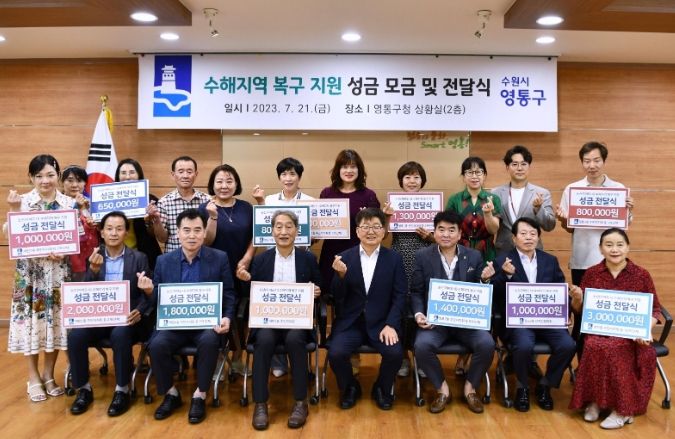 [제주교통복지신문 김강석 기자] 지난 21일, 수원특례시 영통구의 12개 동 주민자치회, 통장협의회 등 40여개의 단체 등에서 집중호우 피해지역 이재민을 돕기 위해 2,230만원 상당의 성금을 모아 영통구에 전달했다.