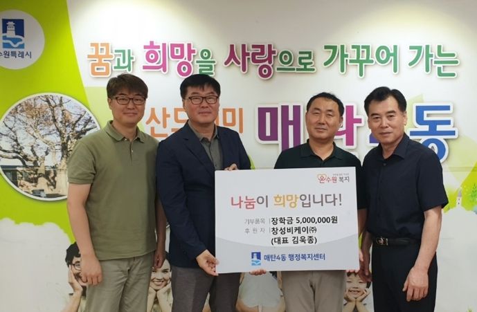 [제주교통복지신문 김강석 기자] 수원시 영통구 매탄4동에 소재한 창성비케이(주) 김욱종 대표(매탄4동 주민자치위원)는 지난 21일, 저소득가정을 위한 장학금 500만원을 매탄4동 행정복지센터에 후원했다.