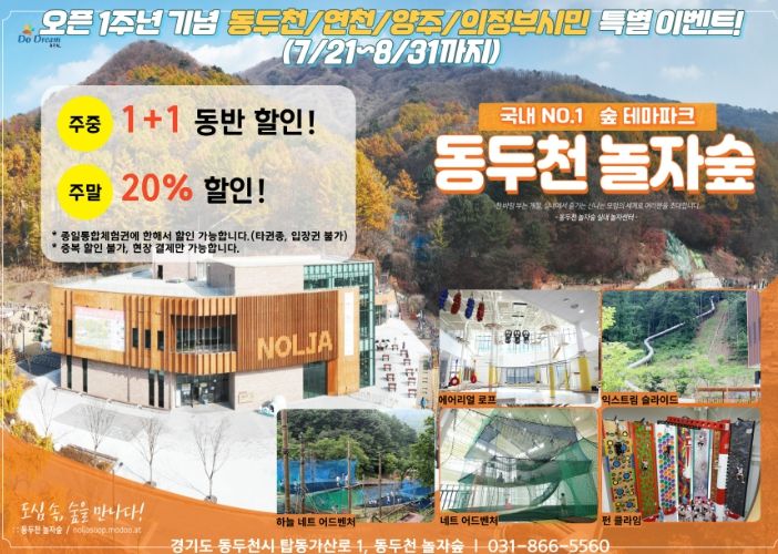 [제주교통복지신문 김강석 기자] 동두천 놀자숲(경기 동두천시 탑동가산로1)은 오는 7월 28일 오픈 1주년을 기념해 인근 시·군민 대상으로 특별 할인 이벤트를 진행한다고 밝혔다.