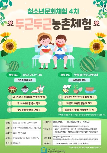 이번 청소년문화체험 4차 ‘두근두근 농촌 체험’은 8월 19일 토요일 경기도 양평군 외갓집체험마을에서 먹거리 체험 및 농촌 체험 등 다양한 활동을 진행할 예정이다.