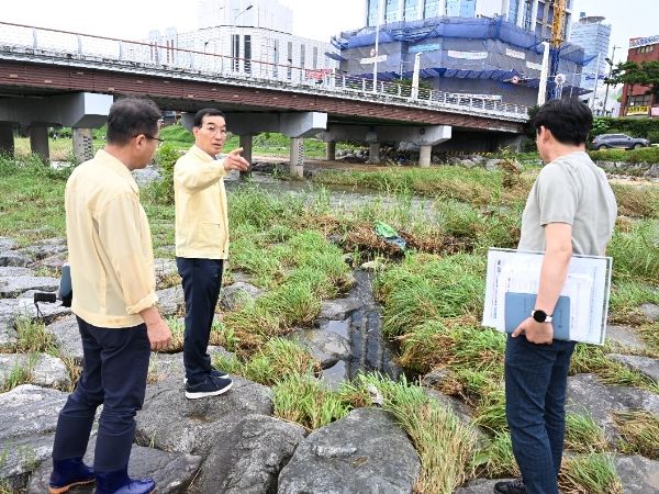 [제주교통복지신문 김강석 기자] 김광신 중구청장은 24일 대전천 일원 현장 점검에 나섰다. 김 청장은 대전천 보문교에서 목척교까지 걸으며 지난 폭우와 주말 새 내린 비로 인한 안전 관리 상황과 시설물 피해 상황을 점검하고, 위험 요소를 즉시 제거하는 등 주민의 안전과 생명을 최우선으로 수해에 철저히 대비할 것을 지시했다.