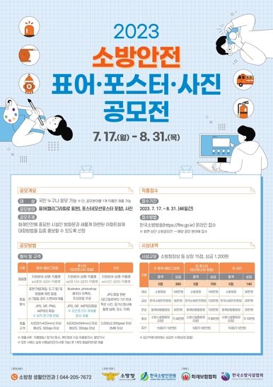 소방청과 한국소방안전원이 주최하는 이번 공모전은 누구나 참여 가능하며, 표어 및 포스터의 공모주제는 방화문의 중요성과 아파트 화재 대피 방법이며, 사진은 소방활동 현장의 극적이고 감동적인 순간 또는 소방안전교육의 재미있고 즐거웠던 순간을 표현하면 된다.