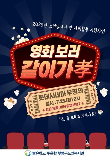 [제주교통복지신문 김강석 기자] 부평구노인복지관는 노인일자리 및 노인사회활동 지원 사업 중 사랑채우미, 학교안전지킴이 사업단 참여자 176명을 대상으로 ‘영화 보러 같이 가孝’ 문화 활동을 오는 25일 실시한다고 밝혔다.