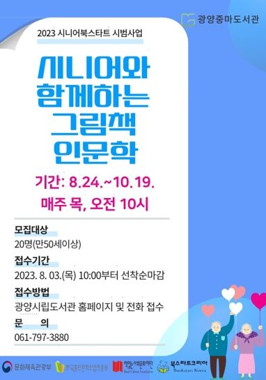 [제주교통복지신문 김강석 기자] 광양중마도서관이 오는 8월 3일부터 50세 이상 시니어를 대상으로 '2023 시니어 북스타트 시범사업' 그림책 인문학 강연 참가자를 모집한다.