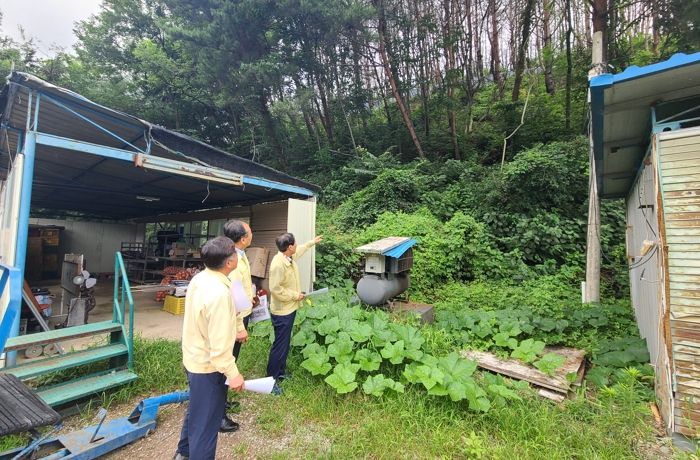성낙인 군수는 고암면 감리 산사태취약지역 방문해 산사태 징후 등 위험 요인을 살펴보고, 이어 토평천 등을 찾아 침수취약도로 시설물과 차단시설 작동 여부를 점검했다.