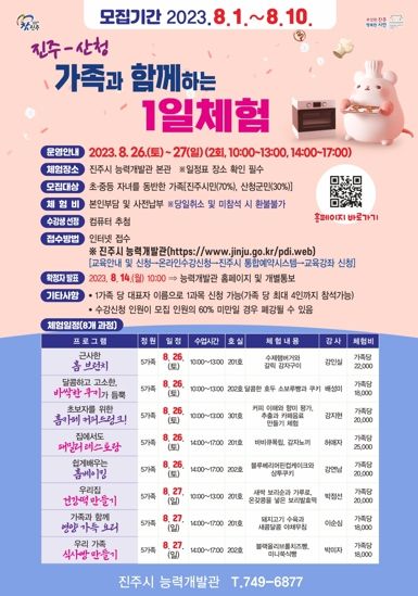 [제주교통복지신문 김강석 기자] 진주시 능력개발관은 “진주-산청 가족과 함께하는 1일 체험”프로그램 참가자를 8월 1일부터 10일까지 모집한다. 떡만들기, 바리스타, 홈베이킹, 제과·제빵, 한식 요리 등 8개 프로그램으로 8월 26,27일 주말 프로그램으로 진행된다.