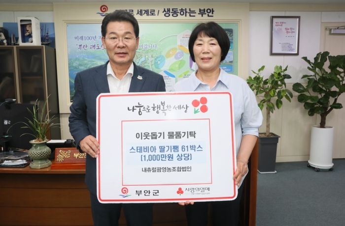 이번 기탁에는 권익현 부안군수와 내츄럴팜 영농조합법인 대표 채명신씨가 참석한 가운데 기탁식을 진행했으며 딸기쨈은 관내 취약계층에게 전달해 줄 것을 부탁했다.