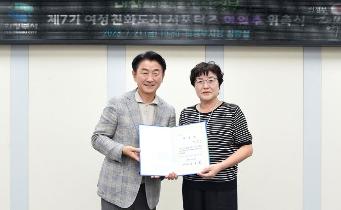 이날 행사에서는 여의주 서포터즈에 새로이 합류한 39명의 시민에게 위촉장을 수여했다. 이어 젠더 전문가인 정우순 강사가 ‘여성친화도시의 이해 및 서포터즈의 역할’이라는 주제로 강의했다.