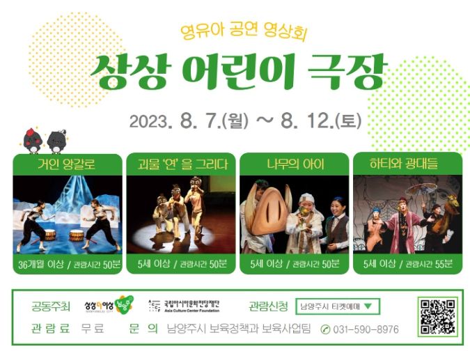 [제주교통복지신문 김강석 기자] 남양주시는 오는 8월 7일부터 12일까지 어린이집 및 양육가정의 영유아를 위해 정약용도서관 공연장 등 3개소에서 어린이 공연 영상회‘상상 어린이 극장’을 운영한다.