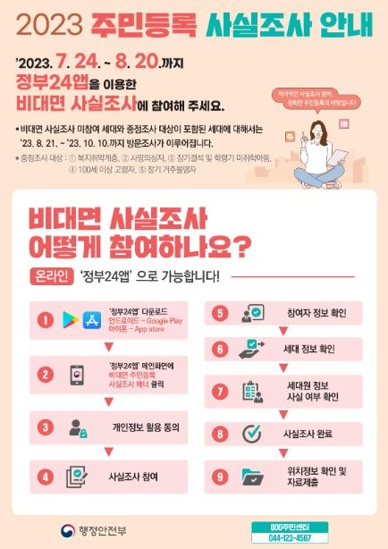 주민등록 사실조사는 비대면-디지털 조사(7. 24. ∼ 8. 20.)를 진행한 이후, 통장 및 동 공무원이 거주지에 방문하여 확인하는 방식으로 조사 (8. 21. ∼ 10. 10.)가 진행된다.