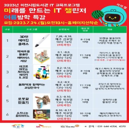 [제주교통복지신문 김강석 기자] 이천시립도서관은 SK하이닉스 후원으로 조성한 IT 교육 공간 행복 IT 스터디랩에서 오는 28일부터 이천시 아동 및 청소년을 위한 여름방학 특강을 운영한다.