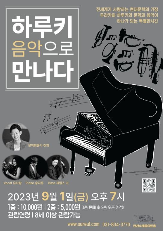 [제주교통복지신문 김강석 기자] 연천수레울아트홀은 8월 문화가 있는 날 공연으로, 9월 1일 오후 7시 '하루키, 음악으로 만나다'를 선보인다.