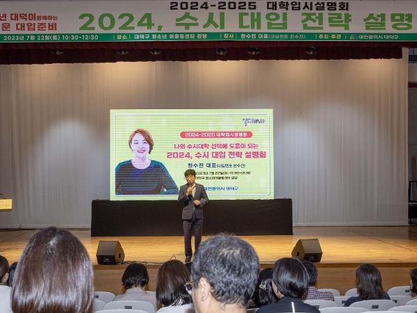 24일 대덕구에 따르면 22일 진행된 ‘2024-2025 대학입시설명회’에서는 대입멘토 한수진 대표의 ‘대입 핵심 이해와 학생부 교과·종합전형의 분석을 통해 나만의 수시 6개 대학을 선택하는 전략 방법’ 특강을 진행해 수시지원을 앞둔 수험생과 학부모들의 관심과 큰 호응을 얻었다.
