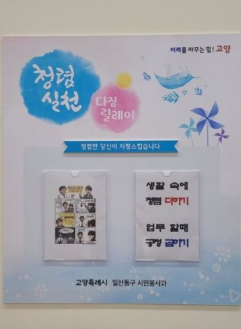 [제주교통복지신문 김강석 기자] 고양특례시 일산동구는 청렴 문화 정착을 위한 다짐의 마음을 담아 시민봉사과 사무실 내에 ‘청렴실천 다짐 릴레이’ 안내판을 설치 및 운영한다고 24일 밝혔다.