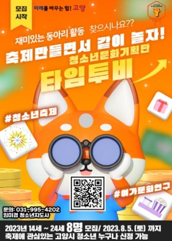 [제주교통복지신문 김강석 기자] 고양시청소년재단(이사장 이동환) 성사청소년문화의집(센터장 이종순)은 청소년의 놀 권리와 여가권의 신장을 위해 청소년의 시각으로 축제를 운영하는 '청소년문화기획단 “타임투비”'의 하반기 동아리원을 모집한다.