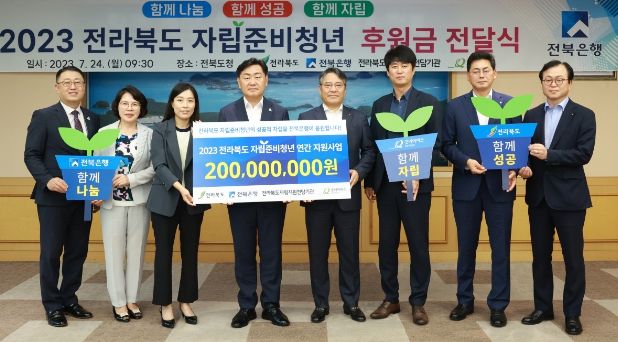전북도는 24일 도청 회의실에서 김관영 도지사와 전북은행 백종일 은행장, 정원호 전북은행 노조위원장, 심경식 전북은행 부행장, 김은호 전북은행 도청지점장, 전숙영 전라북도자립지원전담기관장, 김경환 굿네이버스 전북지역본부장이 참석한 가운데 ‘자립준비청년 지원사업 후원금 기탁식’이 열렸다고 밝혔다.