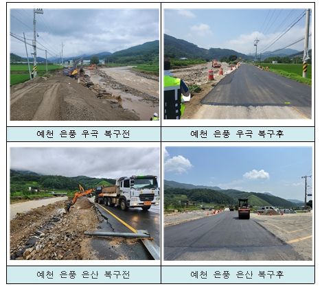 특히, 피해가 가장 컸던 구간은 도로가 유실된 예천군 은풍면 우곡리와 은산리 소재 지방도 901호선으로 인력과 장비를 동원해 응급포장과 흙마대 쌓기를 집중적으로 추진했다.
