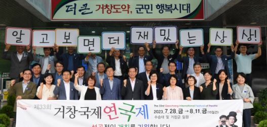 이날 군 공직자 30여 명은 오는 28일부터 8월 11일까지 열리는 거창국제연극제의 성공적인 개최를 응원하며 연극제 표어(슬로건) ‘알고 보면, 더 재밌는 상상!’이 적힌 손팻말을 드는 퍼포먼스를 펼쳤다.