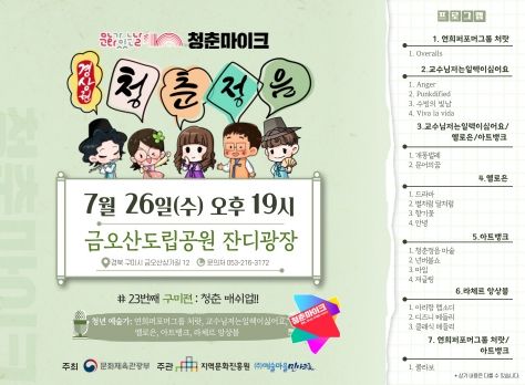 [제주교통복지신문 김강석 기자] 구미시는 26일 금오산 분수광장에서 2023년 문화가 있는 날 '청춘마이크' 경상권 공연을 개최한다.