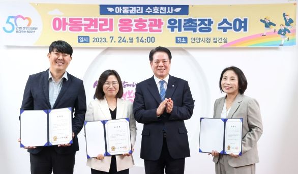 시는 24일 오후 2시 시청 접견실에서 염옥남 변호사(법무법인 우진), 오연주 안양시 가족센터장, 정욱재 굿네이버스 안양지부장 등 3명을 아동권리옹호관으로 위촉했다.