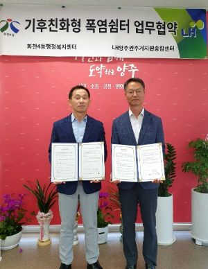 [제주교통복지신문 김강석 기자] 양주시 회천4동은 LH 경기북부지역본부 양주권주거지원종합센터와‘2023년 기후친화형 폭염쉼터 조성사업’업무 협약을 체결했다고 24일 밝혔다.