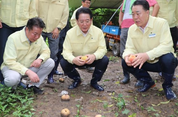 김영록 지사는 화순읍 능주면 복숭아 낙과 피해 현장을 둘러본 후 “수확을 앞둔 농가가 피해를 입어 매우 안타깝다”며 “피해조사를 빠짐없이 실시하고 피해 최소화를 위한 지원 방안을 마련하겠다”고 말했다.