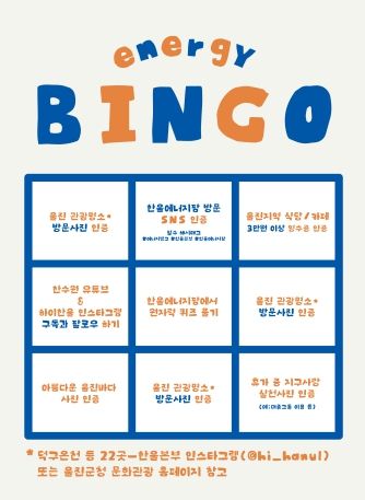 ‘에너지빙고’는 문화관광 활성화를 위해‘울진 관광명소 방문사진 인증’, ‘한울에너지팜에서 원자력 퀴즈 풀기’ 등으로 구성되어 있으며, 이번 이벤트는 29일부터 8월 20일까지 시행한다. 참가를 원하는 사람은 한울본부 인스타그램에서 3×3 빙고 미션을 확인하고 빙고 2줄을 완성하면 된다.