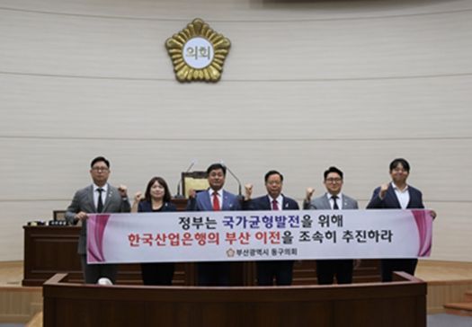 동구의회는 “지난 20여 년간 국가의 지역균형발전 노력에도 불구하고 해결하지 못했던 수도권 일극화와 지방 인구 유출 문제를 해결하려면 수도권과 균형을 이루는 동남권 성장축을 구축하고, 부산을 중심으로 산업은행의 금융지원을 통해 산업 재편 및 신성장 동력산업을 육성하는 것이 절실하다.”고 설명했다.