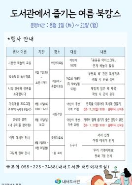 김명규 과장은 “이번 8월 도서관에서 즐기는 여름 북캉스 행사는 풍성하고 내실있는 참여형 행사가 많이 준비되어 있으니 이용자분들의 많은 참여를 바란다”고 말했다.