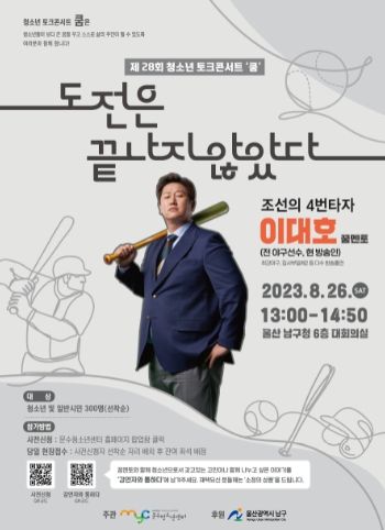 [제주교통복지신문 김강석 기자] 울산 남구는 2023년 청소년 토크콘서트‘쿰’을 8월 26일 남구청 6층 대강당에서 문수청소년센터(시설장 임숙희) 주관으로 개최한다고 밝혔다.
