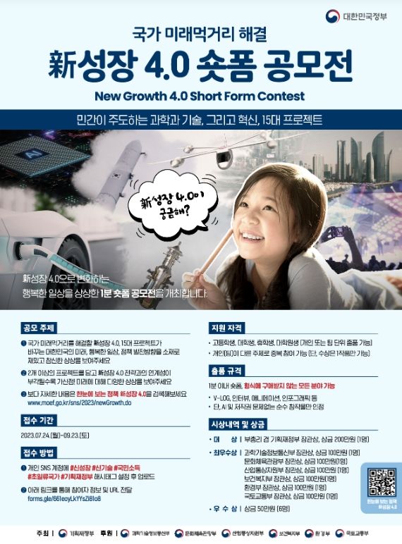 [제주교통복지신문 김강석 기자] 기획재정부는 관계부처와 함께 ‘23년 7월 24일부터 9월 23일까지 두달간 ‘신성장 4.0 숏폼 공모전’을 개최한다.