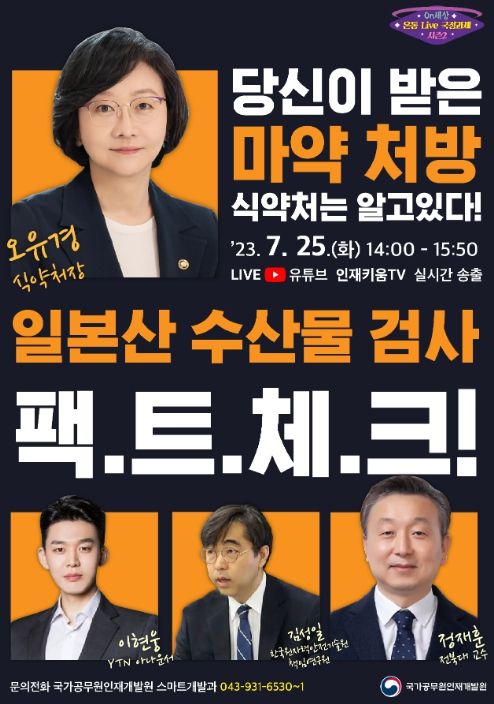 이번 강좌는 전주기 마약류 안전망 강화, 수입식품 안전관리 등 식·의약 안전 행정혁신에 대하여 식약처장이 직접 출연·토론하는 공개강좌로 유튜브 방송 ‘인재키움티비(tv)’에서 실시간 문답이 가능하도록 진행되며, 관심 있는 국민 누구나 시청할 수 있습니다.