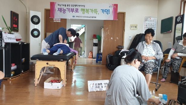 [제주교통복지신문 김강석 기자] 강서구 가덕도동과 동 지역사회보장협의체는 ‘재능기부로 행복가득, 가덕!’ 사업의 일환으로, 지난 7월 19일 명지1동 소재 병원 물리치료사와 명지2동 소재 예하뷰티 원장의 재능기부를 통해 대항경로당 어르신들에게 건강마사지와 손‧발톱 관리서비스를 제공했다.