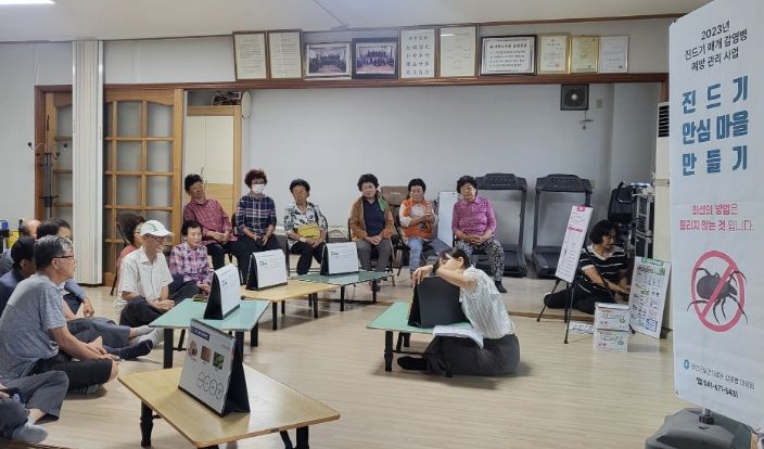 군에 따르면, 태안군보건의료원은 이달부터 8월 초까지 매주 목요일마다 근흥면 내 경로당을 찾아 △진드기 매개 감염병 예방 교육 △기피제 배부 및 올바른 사용법 교육 △각종 전염병 예방 및 관리 교육 등 ’진드기 안심 마을 만들기 사업‘을 진행하고 있다.