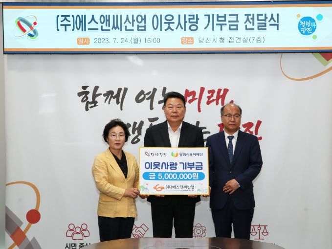[제주교통복지신문 김강석 기자] 육상 금속 골조 구조재를 전문적으로 제조하는 ㈜에스앤씨산업이 24일 당진시청을 방문해 시 출연 기관인 당진시복지재단에 성금 500만 원을 전달했다.