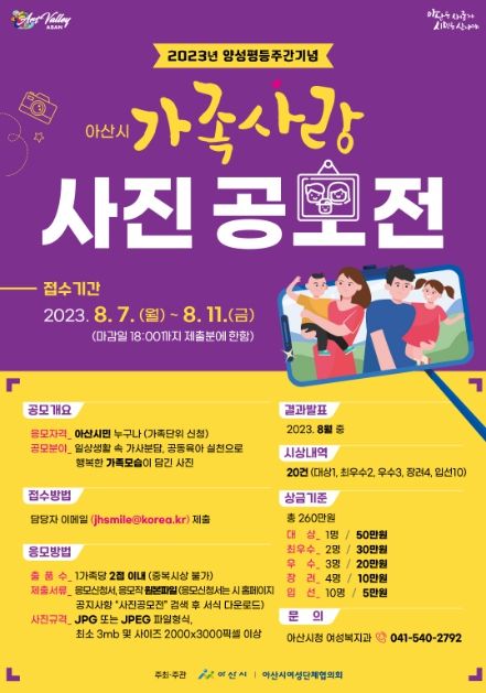 [제주교통복지신문 김강석 기자] 아산시여성단체협의회는 2023년 양성평등주간을 기념해 일상 속 양성평등 의식확산을 위한 ‘아산시 가족사랑 사진공모전’을 개최한다.