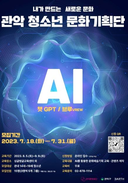 관악문화재단과 함께하는 이번 교육은 ‘스마트도시 관악’이라는 지역 특성에 맞춰 교육의 주제로 ‘AI 인공지능’을 선정했다. 청소년들은 오픈 AI(Open AI)가 개발한 대화 전문 인공지능 ‘챗 GPT’와 동영상 제작 프로그램 ‘브루(Vrew)’를 활용해 다양한 활동을 체험할 수 있다.