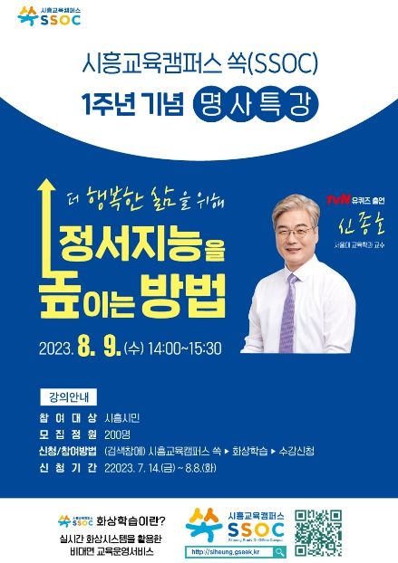 [제주교통복지신문 김강석 기자] 시흥시는 전 연령의 학습권을 강화하고자 운영 중인 온라인 교육 플랫폼 ‘시흥교육캠퍼스 쏙(SSOC)’ 서비스 개시 1주년을 맞아, 오는 8월 9일 온라인 실시간 화상학습 방식으로 명사특강을 선보인다.