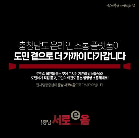 [제주교통복지신문 김강석 기자] 충남도는 다음달 21일부터 온라인 도정 소통 창구 명칭을 기존 ‘만사형통충남’에서 ‘충남 서로 이(e)음’으로 변경한다고 25일 밝혔다.