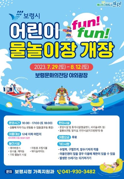 [제주교통복지신문 김강석 기자] 보령시는 오는 29일부터 8월 12일까지 15일간 보령문화의전당 광장에서 ‘보령시 어린이 fun!fun! 물놀이장’을 운영한다.