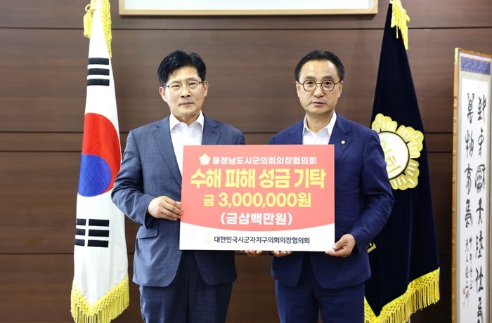 [제주교통복지신문 김강석 기자] 정도희 천안시의회 의장은 24일 대한민국시군자치구의회의장협의회으로부터 충남 수해피지역민을 위한 성금 3백만원을 전달받아 충남시군의회의장협의회 성금 1백만원을 합쳐 특별재난지역으로 선포된 공주시, 논산시, 청양군, 부여군에 각 1백만원씩의 성금을 전달했다.
