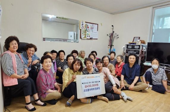[제주교통복지신문 김강석 기자] 영주시 하망동에 소재한 코오롱아파트경로당은 24일 하망동행정복지센터에 방문해 집중호우로 피해를 입은 이재민들을 위해 써달라며 정명여 경로당 회장과 회원 27명의 어르신이 십시일반 모은 성금 45만원을 기탁했다.